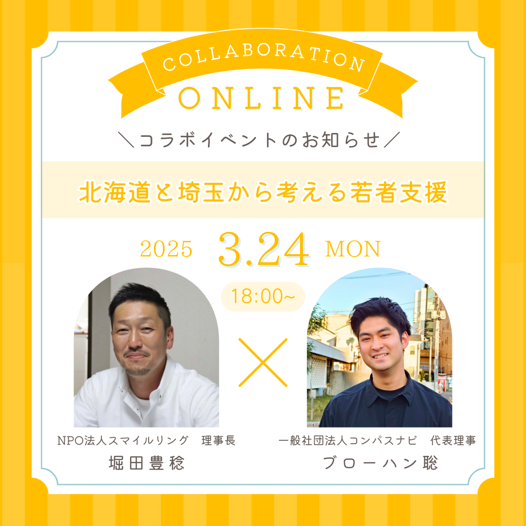 北海道と埼玉、それぞれの地域で若者支援に取り組む 「NPO法人スマイルリング」 と 「一般社団法人コンパスナビ」 がオンラインイベントを共催します!